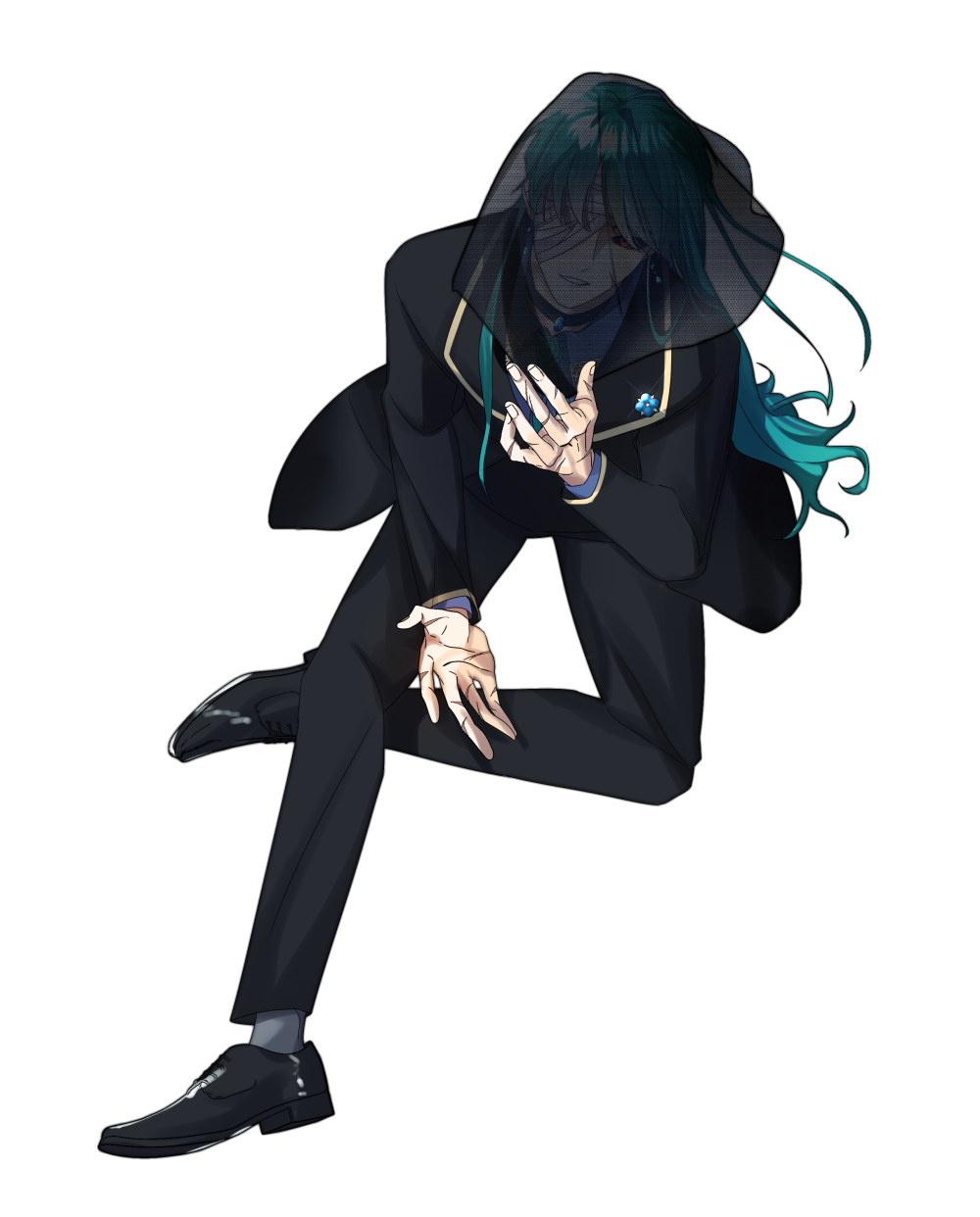 청록색의 머리칼 위로 씌워진 검은 색의 천은 마치 어두운 밤바다를 닮았다. 빛이 들어오지 않는 곳이 익숙한 듯 가려진 시선으로도 그것은 참 편안하다는 듯이 움직이며 사방팔방을 쏘다닌다. 천 아래로는 하얀 색의 오른쪽 눈을 가린 붕대가 자리한다. 푸른 색의 눈은 다를 것이 없다면 언제나 그 색을 유지한다.